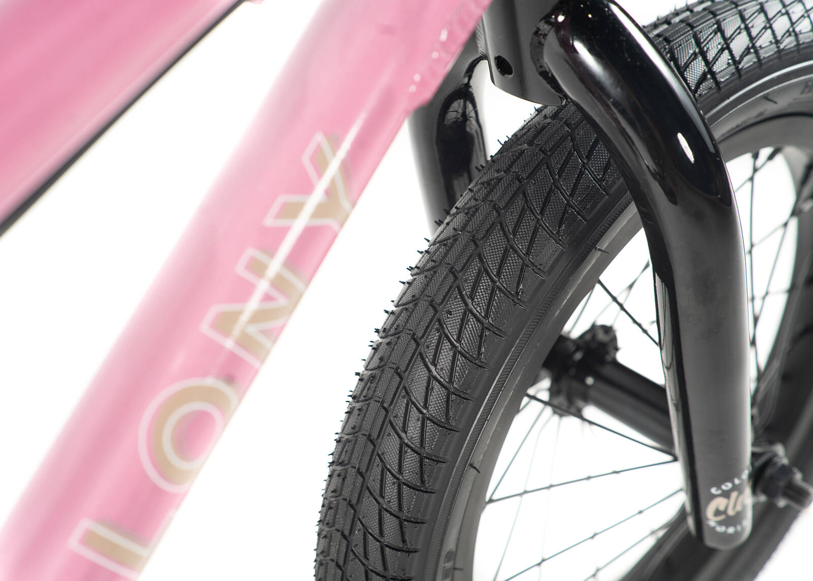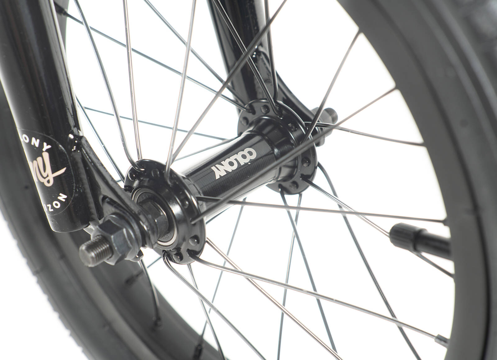 The Colony Horizon also features 14" wheels, Colony Horizon 14” CrMo tapered forks, Colony Horizon CrMo bars (6.5” rise 21.5” wide), and a short-reach brake lever, specially designed for small hands.